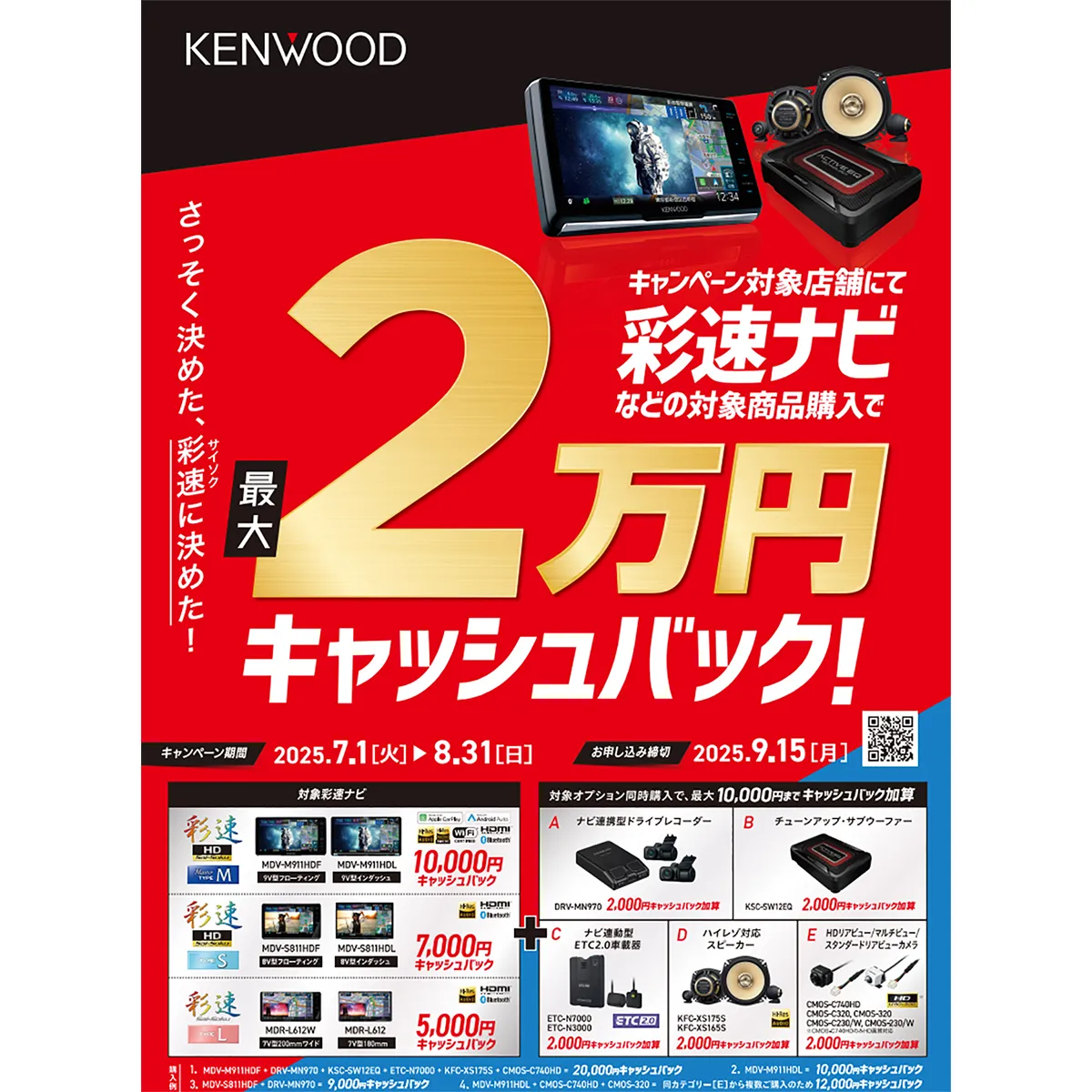 注意事項 | ■メーカーWEBサイト(https://www.kenwood.com/jp/car/2025summer_smart_cb/)に記載の通り、オートバックス公式通販サイトで対象商品を購入かつ、オートバックスの店舗で「取り付け」をした場合のみ、有効となります。申請にはオートバックス店舗で取り付けの際に発行される「作業伝票」の写しが必要となりますのでご注意ください。詳細につきましてはメーカーWEBサイトにてご確認ください ■鮮明な映像を表示する高感度CMOSセンサーを搭載 ・スミアノイズのない高画質な映像で夜間でも高い視認性を確保 ■劣悪な環境にも対応する業界最高水準の防塵・防水性 ・IP67(ケンウッド社内測定による実力値)相当の防塵・防水性を実現。劣悪な環境となる車外取り付けに対応 ■メーカー品番:CMOS-C230W ■カラー:ホワイト ■外形寸法(W×H×D):カメラ部23.4×23.4×23.9mm ■質量(重さ):約21g(コードを除く) ■ケーブル長:カメラ部1.5m 電源ケーブル7.5m ■出力映像:広角鏡像(後方確認用) ■撮影素子:33万画素 1/3.6型 カラーCMOS ■レンズ:広角、焦点距離f=1.12mm F値2.2 ■画角:水平 約128°/垂直 約104° ■映像出力:1Vp-p(75Ω) ■照度範囲:約0.9~10万lux ■電源電圧:14.4V(9~16V) ■最大消費電流:約50mA以下 ■ケンウッドナビ専用 ※商品留意事項 ※ブラケットは必要に応じてビス止めを行なってください。ただし、その場合は、ボディへの加工はお客様の責任で行なってください。それによる車両のサビ、破損など一切の責任は負いません ■対応ケンウッドナビ:MDV-M805L、MDV-M705W、MDV-M705、MDV-Z904W、MDV-Z904、MDV-Z704W、MDV-Z704、MDV-L504W、MDV-L504、MDV-L404W、MDV-L404、MDV-L503W、MDV-L503、MDV-L403W、MDV-L403 |